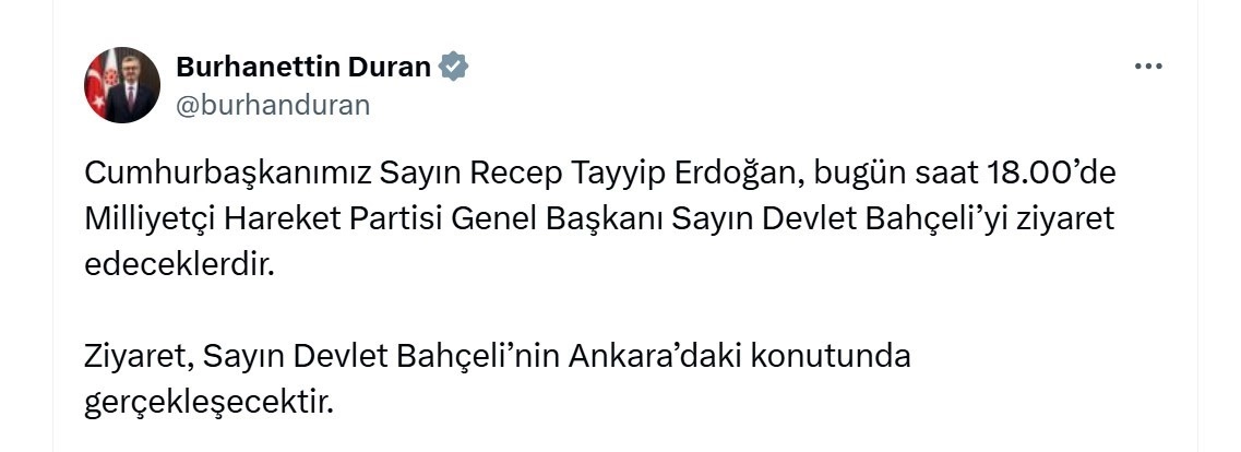 Cumhurbaşkanlığı İletişim Başkanı Burhanettin Duran, sosyal medya hesabından yaptığı paylaşımda, Cumhurbaşkanı Recep Tayyip Erdoğan’ın bugün saat 18.00’de MHP Genel Başkanı Devlet Bahçeli’yi ziyaret edeceğini açıkladı. Duran, ziyaretin Devlet Bahçeli’nin Ankara’daki konutunda gerçekleşeceğini bildirdi.