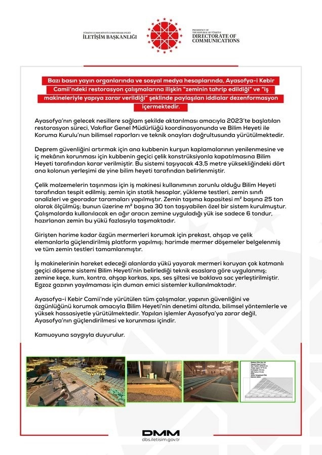 DMM, sosyal medya hesabından yaptığı paylaşımda Ayasofya-i Kebir Camii’ndeki restorasyon çalışmalarına ilişkin ‘zeminin tahrip edildiği’ ve ‘iş makineleriyle yapıya zarar verildiği’ iddialarının dezenformasyon içerdiğini ve deprem güvenliğini artırmak için ana kubbenin kurşun kaplamalarının yenilenmesine ve iç mekanın korunması için kubbenin geçici çelik konstrüksiyonla kapatılmasına Bilim Heyeti’nce karar verildiğini açıkladı.