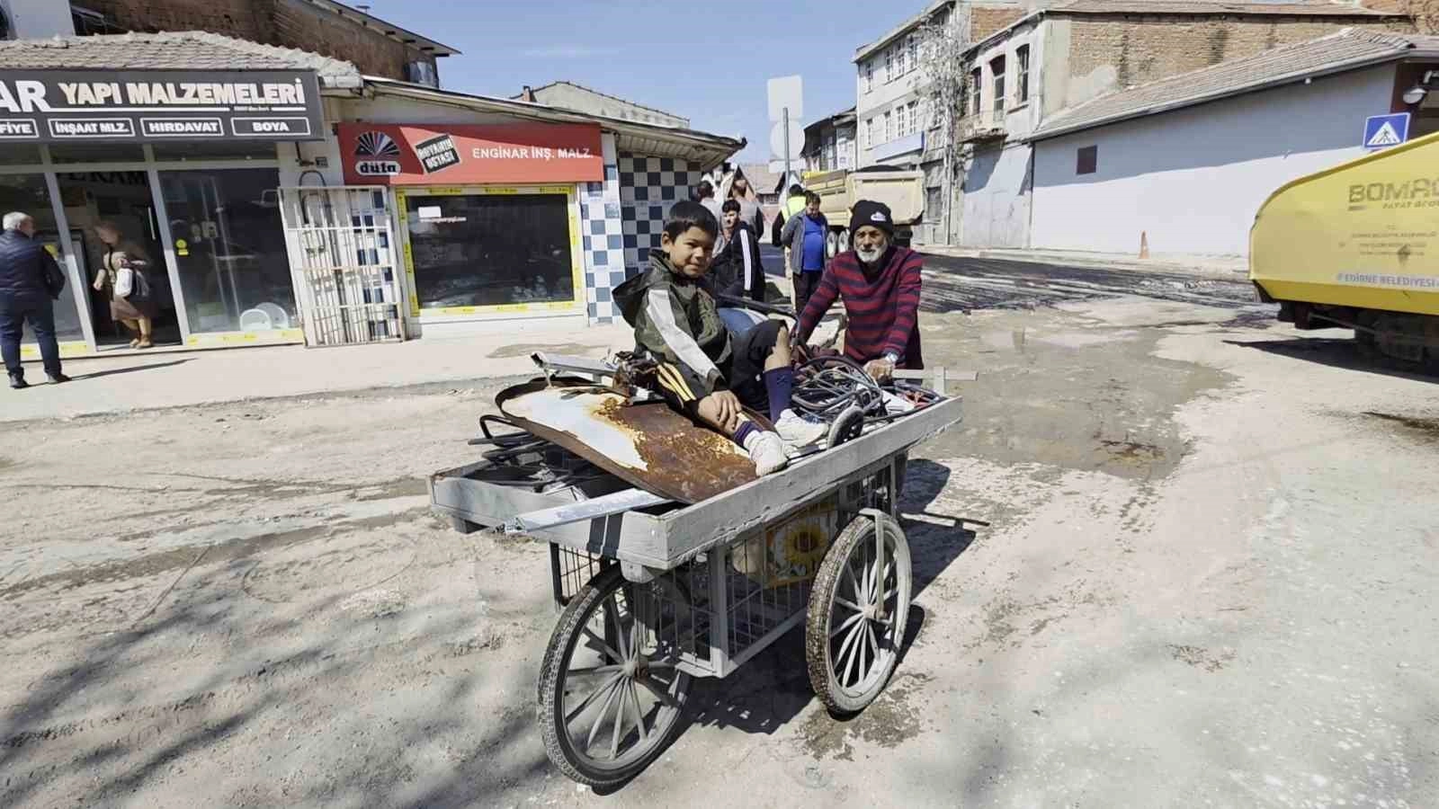 Edirne’de 23 Nisan Ulusal Egemenlik ve Çocuk Bayramı’nda çocuklar parklar, etkinlik alanları ve okul programlarına katılırsın, 6 yaşındaki Ömer Mızga ise dedesi Mustafa Mızga ile birlikte hurdaları satmak için yola koyuldu.