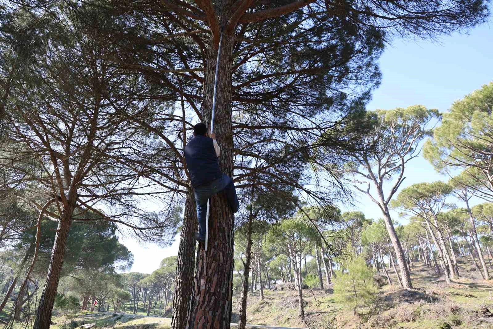 Son yıllarda Aydın’da dağlık alanlarda sıkça dikilip yetiştirilmeye başlanan çam fıstığı hem çiftçilerin hem de çalışanların yüzünü güldürüyor. Toptan olarak kilosu 3 bin TL’den satılan fıstık çamlarının bir tek kozalağı bile altın değerinde olurken yaklaşık 30-35 metre yüksekliğe sahip çam ağaçlarının tepesinde bulunan kozalakları toplamak da oldukça zor ve tehlikeli. İşçilerin maharetli bir şekilde metrelerce yükseklikteki ağaçlara tırmanışları ise görenleri şaşırtıyor. Adeta bir komando gibi ağaçlara rahat bir şekilde çıkan ve üzerinde gezinen işçiler, tehlikeli olsa da işini severek yapıyor.