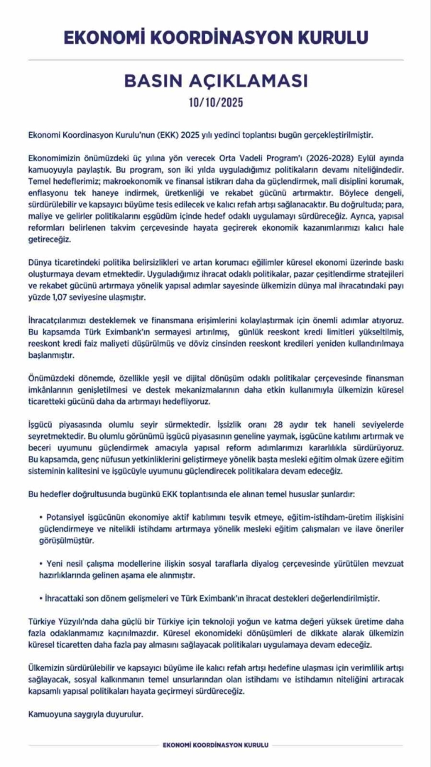 Önümüzdeki dönemde özellikle yeşil ve dijital dönüşüm odaklı politikalar çerçevesinde finansman imkânlarının genişletilmesi ve destek mekanizmalarının daha etkin kullanımıyla Türkiye’nin küresel ticaretteki gücünü daha da artırmanını hedeflendiği belirtilen açıklamada, "İşgücü piyasasında olumlu seyir sürmektedir. İşsizlik oranı 28 aydır tek haneli seviyelerde seyretmektedir. Bu olumlu görünümü işgücü piyasasının geneline yaymak, işgücüne katılımı artırmak ve beceri uyumunu güçlendirmek amacıyla yapısal reform adımlarımızı kararlılıkla sürdürüyoruz. Bu kapsamda genç nüfusun yetkinliklerini geliştirmeye yönelik başta mesleki eğitim olmak üzere eğitim sisteminin kalitesini ve işgücüyle uyumunu güçlendirecek politikalara devam edeceğiz" denildi.