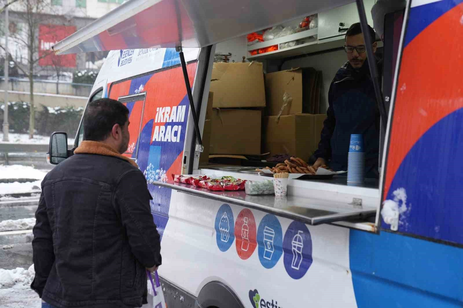 Esenler Belediyesi Halkla İlişkiler ekipleri, etkili olan kar yağışı nedeniyle ilçenin yoğun noktalarında vatandaşlara çeşitli ikramlarda bulundu. İstanbul Valiliği ile koordinasyon içinde gerçekleştirilen çalışmalar kapsamında, sabah saatlerinden itibaren işe giden, trafikte beklemek zorunda kalan ve gün içinde dışarıda bulunan vatandaşlara hizmet veren ESTİM İkram Aracı ile 5 bin kişiye ulaşıldı. Vatandaşlara sunulan sıcak ve soğuk ikramlarla kar yağışının etkili olduğu kış günlerinde yaşanan zor şartlara destek olundu.