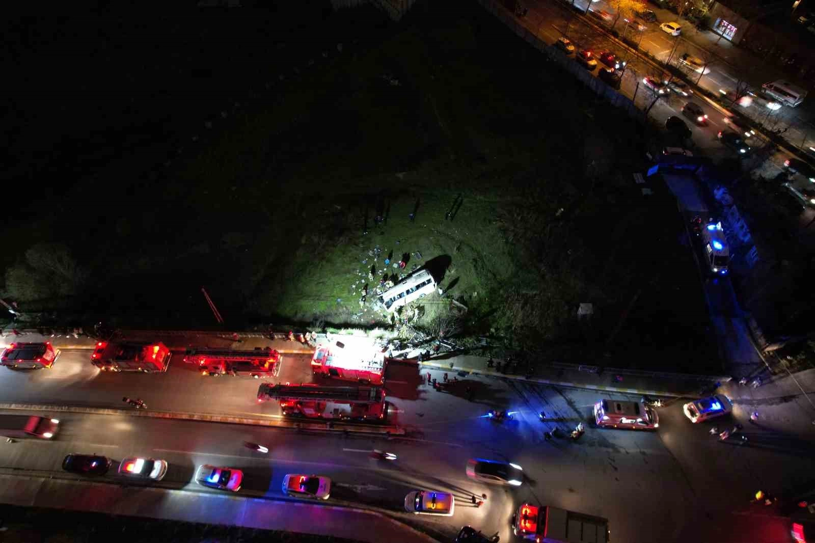 Esenyurt’ta kontrolden çıkan ve 2 kişinin hayatını kaybettiği, 9 kişinin yaralandığı servis minibüsünün şarampole yuvarlandığı kaza alanı dron ile görüntülendi.