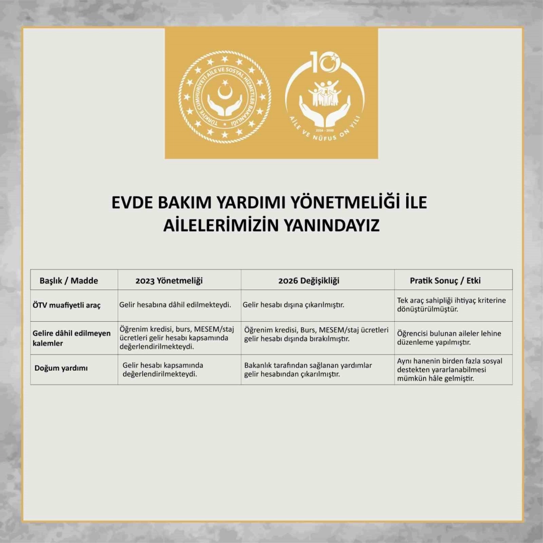 Buna göre, hane gelirinin hesaplanmasına ilişkin usul ve esaslar, evde bakımdan yararlananların lehine olacak şekilde yeniden düzenlendi. Değişiklik, özellikle taşınmaz, araç ve bazı sosyal ve eğitim destek ödemelerinin hane gelir hesabına dahil edilme biçiminde sadeleştirme ve netleştirme sağlayacak.