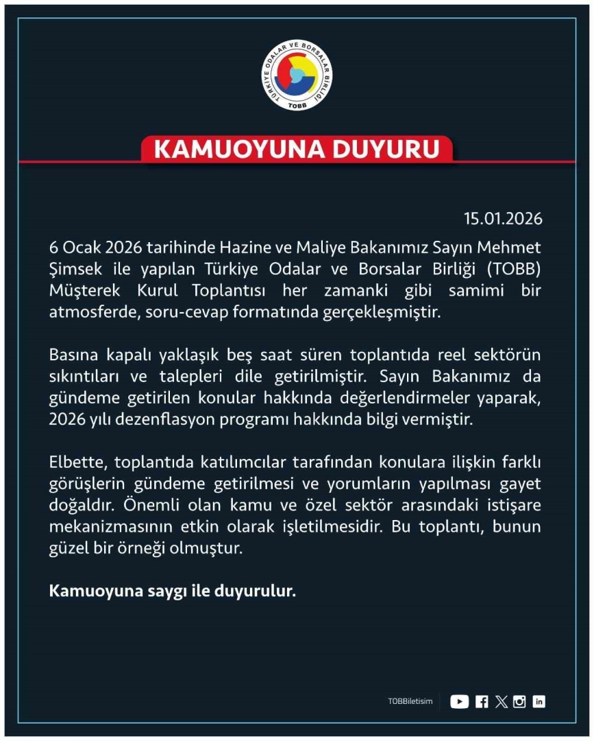 "6 Ocak tarihinde Hazine ve Maliye Bakanımız Mehmet Şimşek ile yapılan Türkiye Odalar ve Borsalar Birliği (TOBB) Müşterek Kurul Toplantısı her zamanki gibi samimi bir atmosferde, soru-cevap formatında gerçekleşmiştir. Basına kapalı yaklaşık 5 saat süren toplantıda reel sektörün sıkıntıları ve talepleri dile getirilmiştir. Bakanımız da gündeme getirilen konular hakkında değerlendirmeler yaparak, 2026 yılı dezenflasyon programı hakkında bilgi vermiştir. Elbette, toplantıda katılımcılar tarafından konulara ilişkin farklı görüşlerin gündeme getirilmesi ve yorumların yapılması gayet doğaldır. Önemli olan kamu ve özel sektör arasındaki istişare mekanizmasının etkin olarak işletilmesidir. Bu toplantı, bunun güzel bir örneği olmuştur."