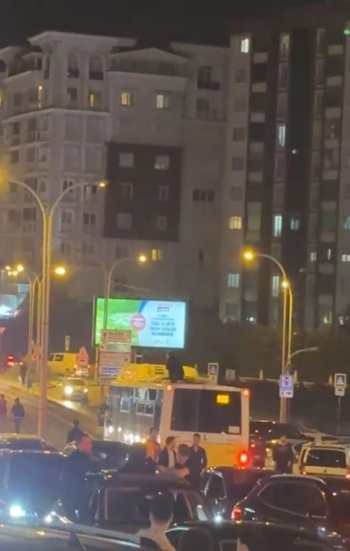 Bir kişinin İETT otobüsü üzerinde yolculuk yaptığı görülürken, bazı vatandaşlar da araçların üzerine çıkarak tezahürat yaptı.