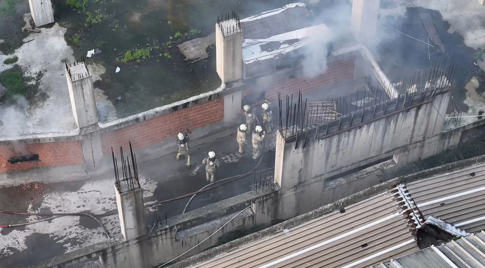İtfaiyecilerin yangına müdahalesi sürerken, ekiplerin duvarı balyozla kırarak çalışma yapması dron kamerasına yansıdı.