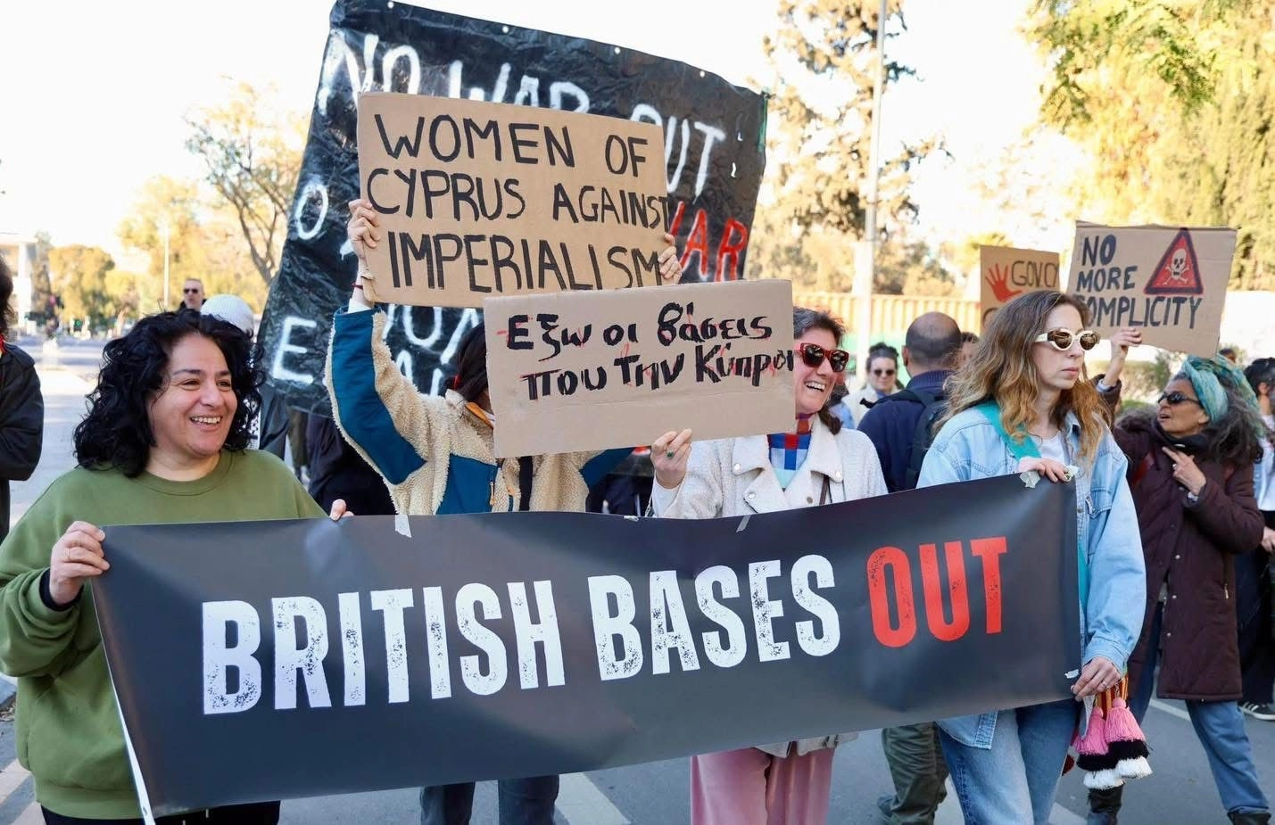 Güney Kıbrıs Rum Yönetimi’nin (GKRY) başkenti Lefkoşa’da, bölgedeki İngiliz askeri üslerine yönelik düzenlenen protestolarda göstericiler, "Kıbrıs fırlatma rampanız değil" sloganları attı.