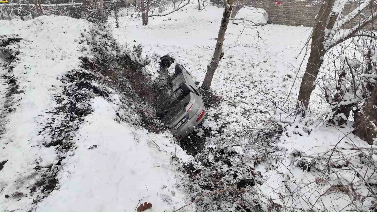 Edinilen bilgilere göre, 34 KE 2161 plakalı otomobilin sürücüsü S.K., karla kaplanan ve kayganlaşan yokuşta kontrolünü kaybetti. Savrulan araç, yol kenarındaki dereye uçarak durabildi. Kazanın ardından çevredekilerin ihbarı üzerine olay yerine itfaiye, sağlık ve polis ekipleri sevk edildi.