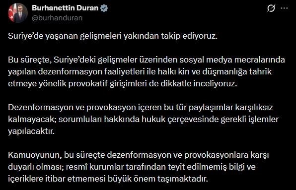 İletişim Başkanı Burhanettin Duran, sosyal medya hesabından yaptığı paylaşımda, Suriye’de yaşanan gelişmeleri yakından takip ettiklerini belirterek, "Bu süreçte, Suriye’deki gelişmeler üzerinden sosyal medya mecralarında yapılan dezenformasyon faaliyetleri ile halkı kin ve düşmanlığa tahrik etmeye yönelik provokatif girişimleri de dikkatle inceliyoruz. Dezenformasyon ve provokasyon içeren bu tür paylaşımlar karşılıksız kalmayacak; sorumluları hakkında hukuk çerçevesinde gerekli işlemler yapılacaktır. Kamuoyunun, bu süreçte dezenformasyon ve provokasyonlara karşı duyarlı olması; resmi kurumlar tarafından teyit edilmemiş bilgi ve içeriklere itibar etmemesi büyük önem taşımaktadır" ifadelerine yer verdi.