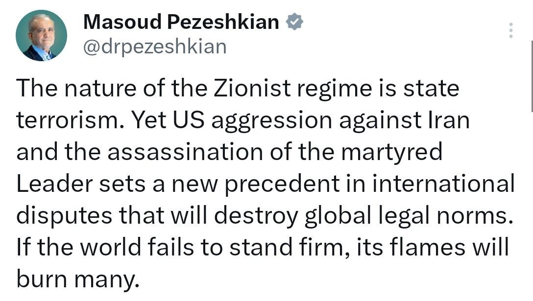 İran Cumhurbaşkanı Mesut Pezeşkiyan, devlet terörizminin İsrail’deki siyonist rejimin doğası olduğunu belirterek, "Ancak, ABD’nin İran’a karşı saldırganlığı ve şehit liderimize yönelik suikast uluslararası hukuk normlarını yıkan yeni bir emsal teşkil etmektedir