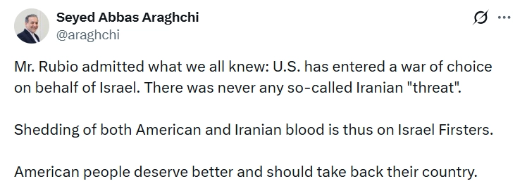 İran Dışişleri Bakanı Abbas Arakçi, ABD Dışişleri Bakanı Marco Rubio’nun İran’a yapılan saldırılarla ilgili açıklamalarına atıfta bulunarak, "Bay Rubio hepimizin bildiği bir şeyi itiraf etti: ’ABD, İsrail adına kendi tercihiyle bir savaşa girdi.’ Sözde bir İran ‘tehdidi’ hiçbir zaman yoktu" dedi.