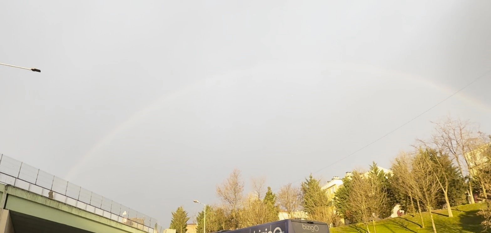 İstanbul’da gün boyu etkili olan soğuk ve yağışlı havada gökyüzündeki kara bulutların dağılmasının ardından gökkuşağı oluştu. Gökkuşağının manzarası kendine hayran bıraktı. Hasdal civarında görünen gökkuşağı kısa bir süre sonra kayboldu. Gökkuşağının manzarası ise kendine hayran bıraktı.