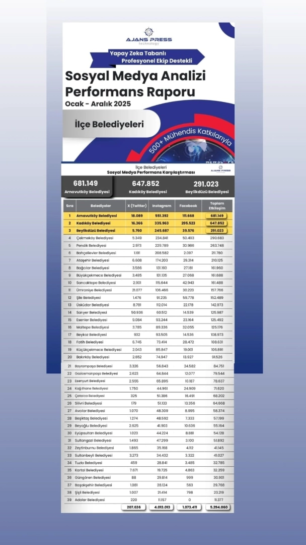 İstanbul’daki ilçe belediyelerinin sosyal medya performansları karşılaştırıldı. Açıklanan verilere göre, 2025 yılı sosyal medya etkileşim rakamlarında Arnavutköy Belediyesi ilk sırada yer aldı. X, Instagram ve Facebook platformları üzerinden elde edilen toplam etkileşimlerin değerlendirildiği karşılaştırmada Arnavutköy Belediyesi, 681 bin 149 etkileşimle listenin zirvesine yerleşti. Arnavutköy’ü Kadıköy Belediyesi 647 bin 852 etkileşimle ikinci sıradan takip ederken, Beylikdüzü Belediyesi 291 bin 23 etkileşimle üçüncü sırada yer aldı.