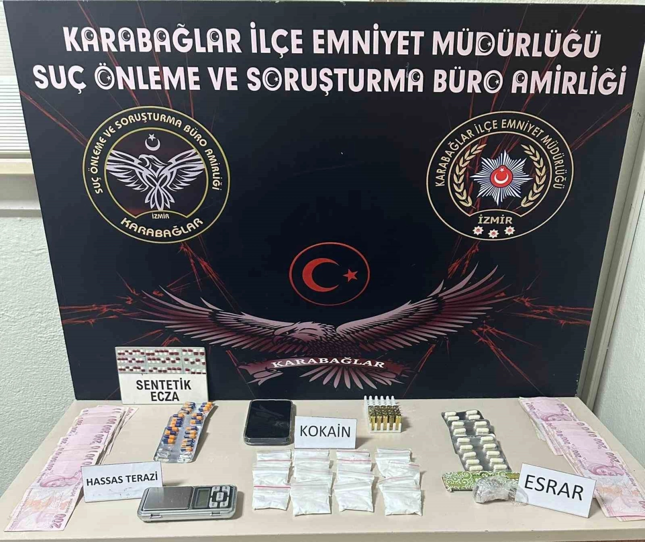 Edinilen bilgiye göre, Karabağlar İlçe Emniyet Müdürlüğü ekipleri, uyuşturucu madde ticareti ile mücadele çalışmaları kapsamında U.T. (35) ve kız arkadaşı B.I.’yı (32) takibe aldı. Yapılan takip sonucu harekete geçen ekipler, şüphelilerin bulunduğu aracı durdurdu. Araçta yapılan detaylı aramada; 18 parça halinde paketlenerek sokak satışı için hazır hale getirilmiş toplam 92,20 gram kokain, 67 adet uyuşturucu hap, 4,90 gram esrar maddesi, 1 adet hassas terazi, 25 adet tabanca fişeği ve suçtan elde edildiği değerlendirilen 7 bin 800 TL nakit para ele geçirildi. Olayla ilgili gözaltına alınan U.T. ve B.I. hakkında "Uyuşturucu veya uyarıcı madde ticareti yapmak" suçundan adli işlem başlatıldı. Emniyetteki işlemleri tamamlanan şüphelilerin bugün adliyeye sevk edileceği öğrenildi.
