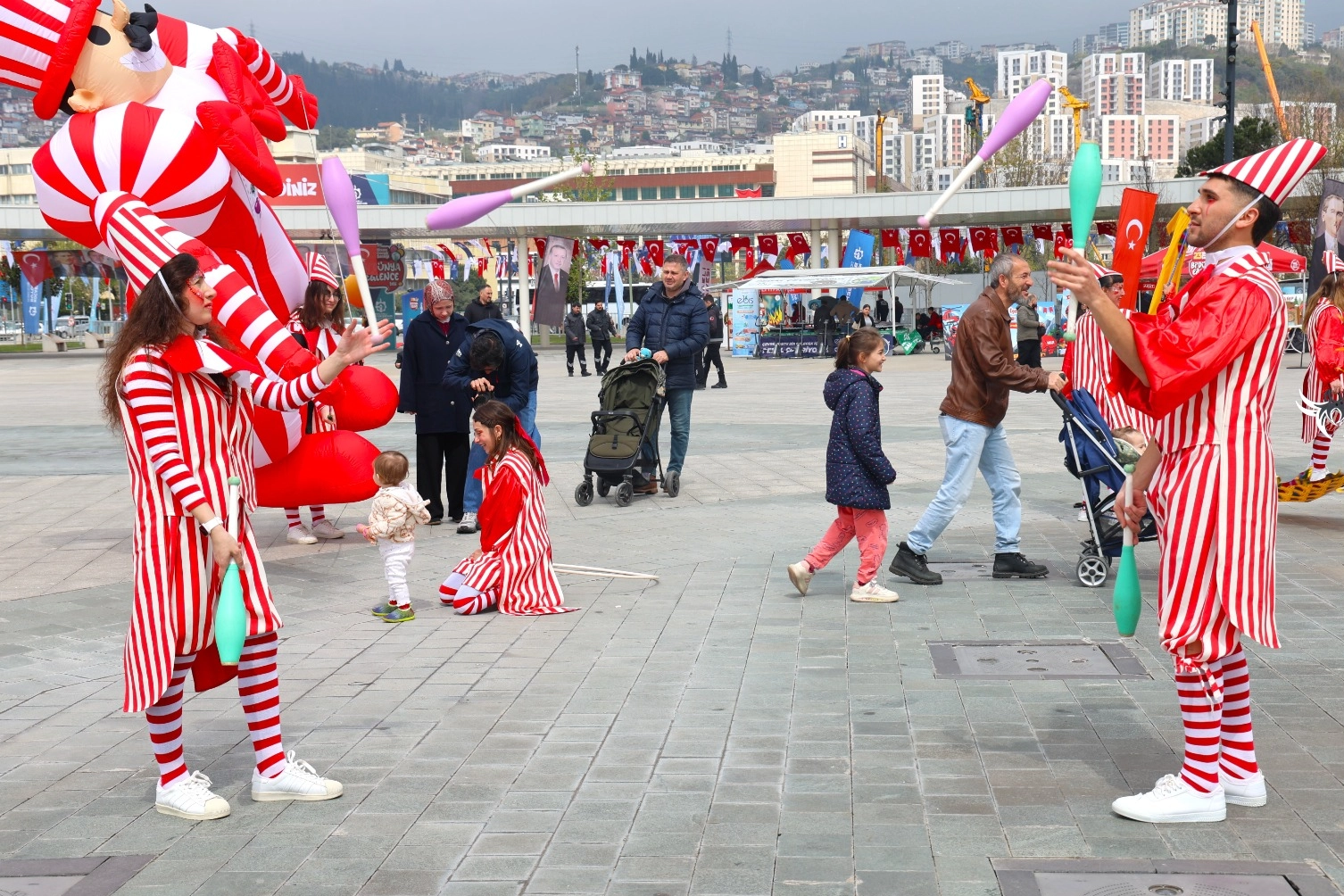 İzmit Milli İrade Meydanı’nda resim küpü ve çocuk sanatçıların eserlerinin yer aldığı sergi alanı da geleceğin sanatçılarını ağırladı. En sevimli görüntüler ise hiç kuşkusuz alanda dolaşan jonglör, palyaço, canlı heykel, tahta bacak maskottan geldi. Çocuklarla fotoğraf çektiren palyaçolar, oyunlara da eşlik etti. Kocaeli Büyükşehir Belediyesi tarafından düzenlenen Bi Dünya Eğlence 23 Nisan şenliklerine tüm çocuklar ve aileleri davetli.