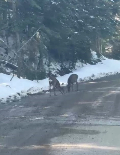 Kastamonu’nun Daday ilçesinde yoldaki çukurdan su içen karacalar, su içerken görüntülendi.