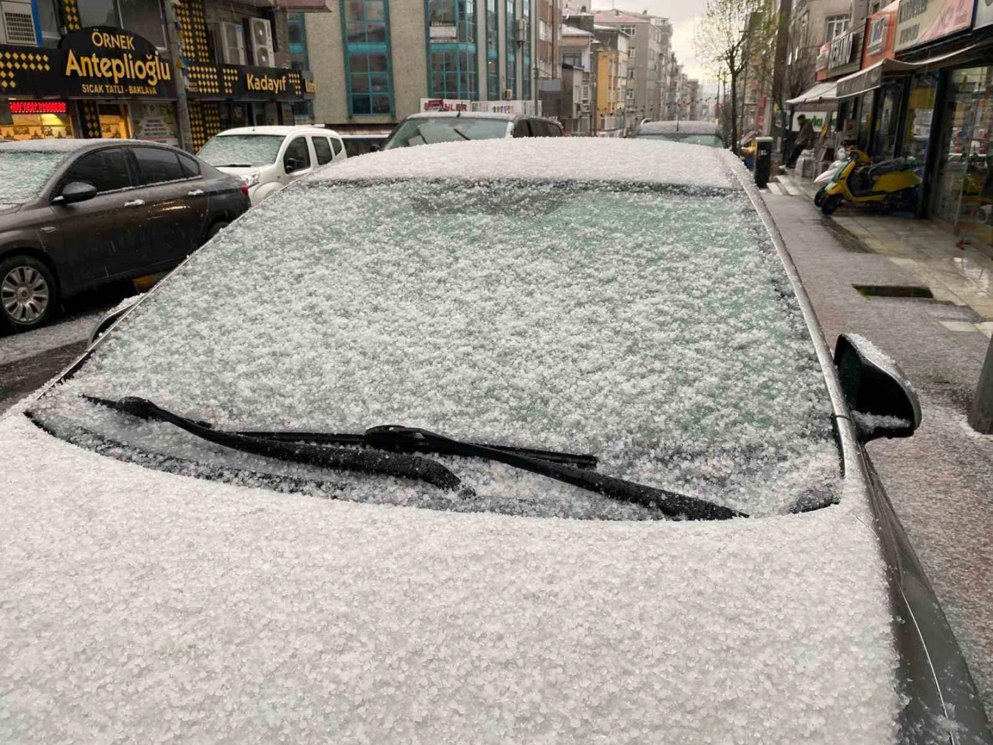 İstanbul’un Küçükçekmece ilçesinde etkili olan dolu yağışı, ortalığı beyaza bürüdü