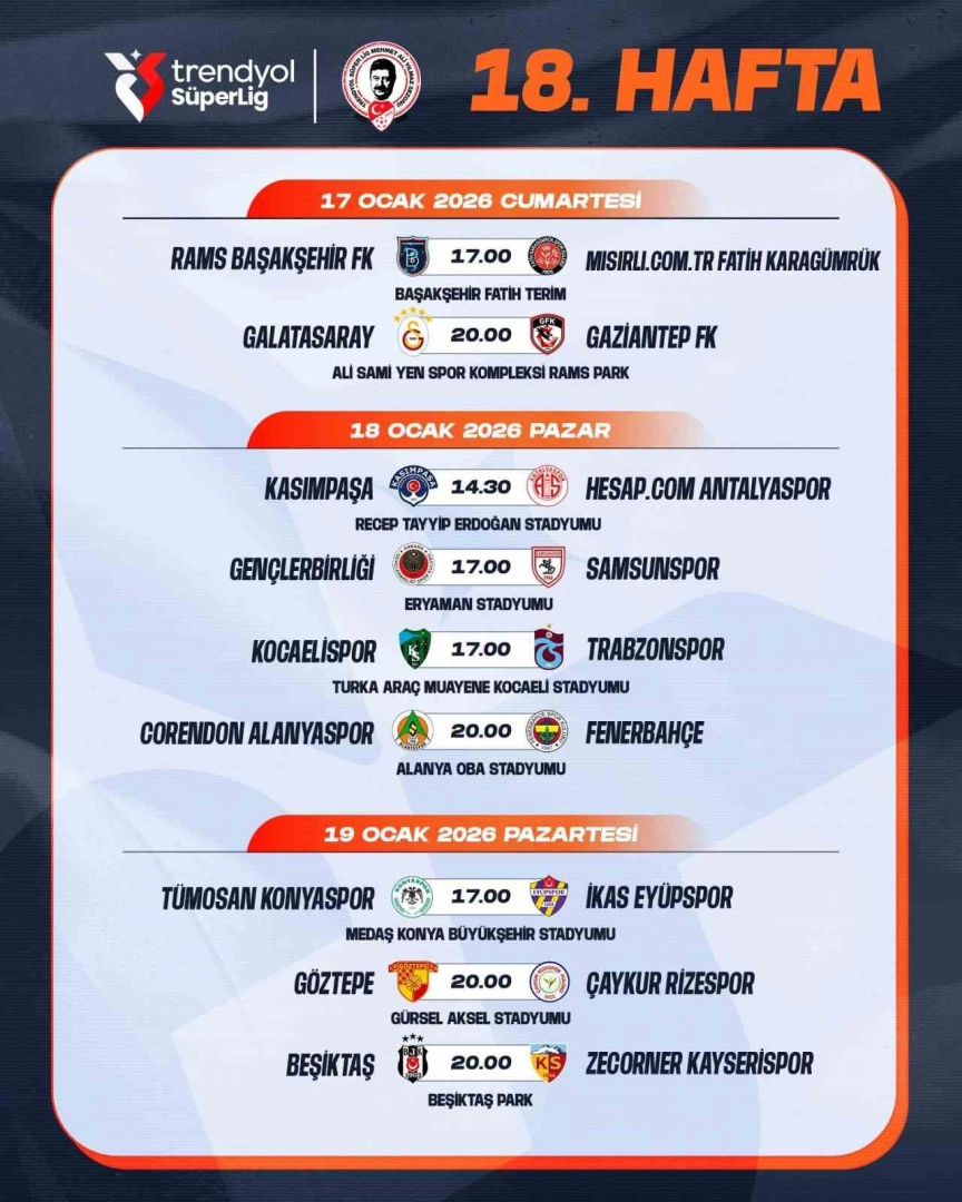 Trendyol Süper Lig’de 18. ve 19. haftalarda oynanacak müsabakaların programı belli oldu. TFF’nin sitesinden yapılan açıklamaya göre, söz konusu haftaların programı şu şekilde: