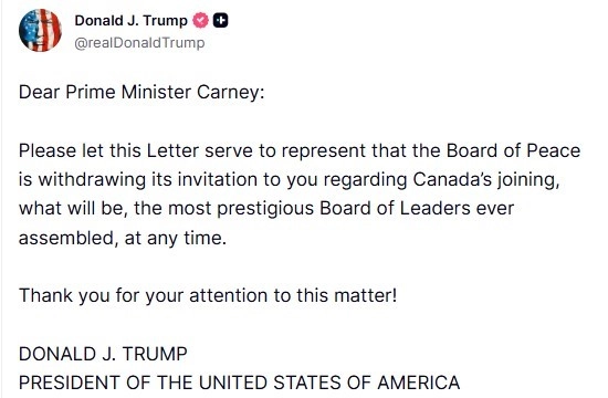 ABD Başkanı Donald Trump, Kanada Başbakanı Mark Carney’e yaptığı Gazze Barış Kurulu’na katılım davetini geri çektiğini açıkladı.