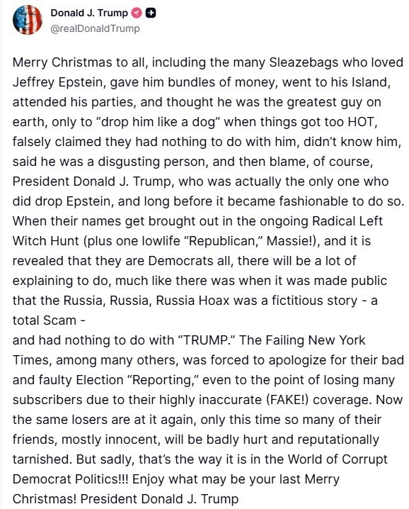 ABD basınını da Epstein belgeleri konusundaki tutumu nedeniyle eleştiren Trump, New York Times gazetesi dahil birçok "başarısız" basın kuruluşunun hatalı seçim haberleri için özür dilemek zorunda kaldığını ya da abone kaybettiğini hatırlattı. Şimdi aynı hatanın Epstein belgeleri konusunda yapıldığını savunan Trump, "Ancak bu sefer çoğu masum olan birçok arkadaşları ciddi şekilde zarar görecek ve itibarları zedelenecek. Ama ne yazık ki, yozlaşmış Demokrat siyaset dünyasında işler böyle yürüyor" dedi. Trump, "Belki de son mutlu Noeliniz olacak bugünün tadını çıkarın" ifadelerini kullandı.
