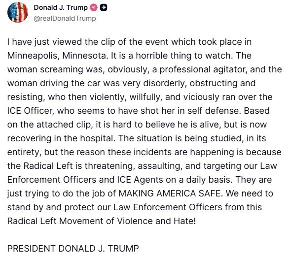 ABD Başkanı Donald Trump, ABD Göçmenlik ve Gümrük Muhafaza Dairesi (ICE) ajanlarının verilen emre uymayan ve aracıyla hareket eden bir kadını vurarak öldürmesi ile ilgili olarak, "Bu olayların yaşanmasının nedeni, radikal solun her gün kolluk kuvvetlerimizi ve ICE ajanlarımızı tehdit etmesi, onlara saldırması ve onları hedef almasıdır" açıklamasında bulundu.
