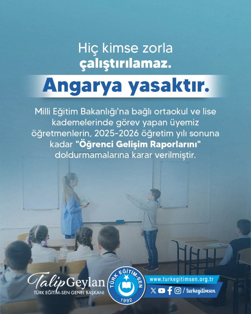 Türk Eğitim Sendikası tarafından yapılan açıklamada, "Angarya iş yükünün kaldırılması, hukuka aykırı uygulamanın sonlandırılması amacıyla; Milli Eğitim Bakanlığı’na bağlı ortaokul ve lise kademelerinde görev yapan üyemiz öğretmenlerin, 2025-2026 öğretim yılı sonuna kadar ‘Öğrenci Gelişim Raporlarını’ doldurmamalarına karar verilmiştir" denildi.