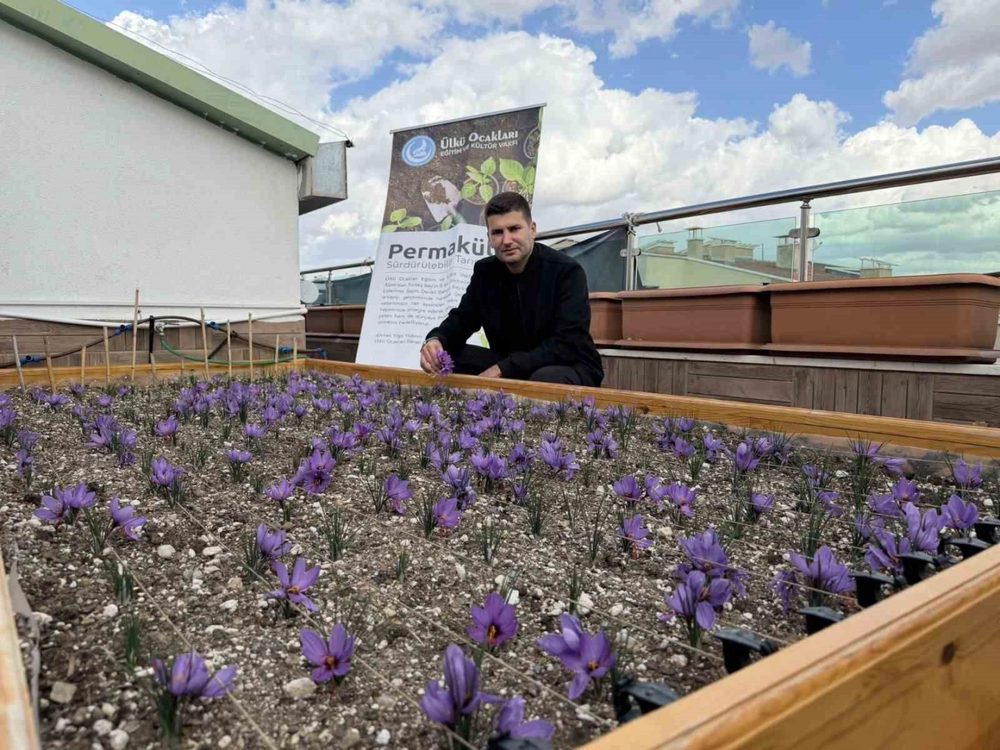 Ülkü Ocakları Genel Merkezi’nin çatısında gerçekleştirilen proje kapsamında, safran bitkisi başarıyla yetiştirildi.