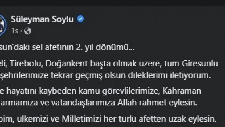 İçişleri Bakanı Süleyman Soylu, Giresun'da 22 Ağustos 2020 tarihinde yaşanan sel afetinin ikinci yıldönümü nedeniyle sosyal medya hesabından bir paylaşımda bulundu.