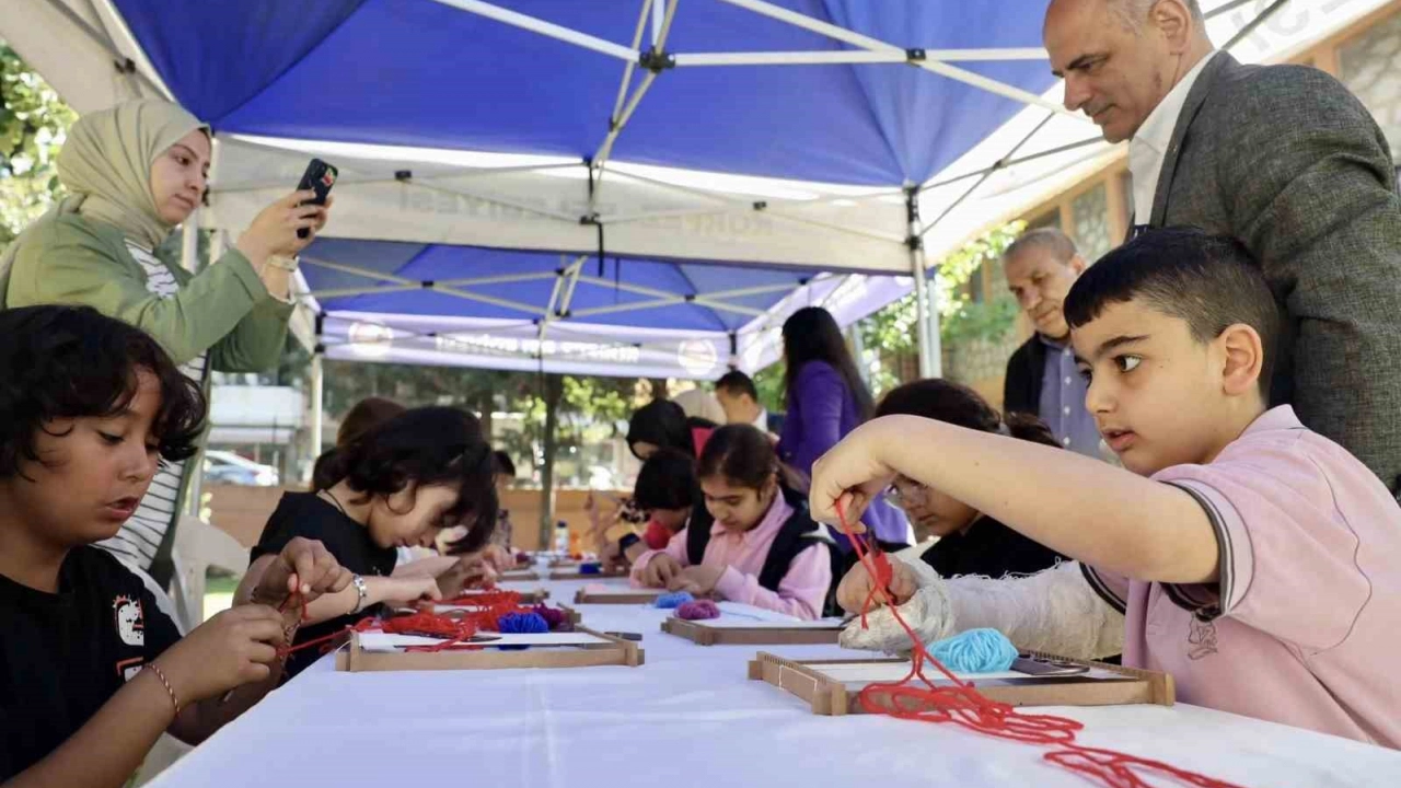 Minyatür halıları dokuyan çocuklar, keyifli bir gün geçirdi. Körfez Belediye Başkanı Şener Söğüt de zaman zaman çocuklara yardım etti.