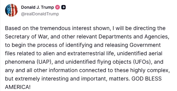 ABD Başkanı Donald Trump, dünya dışı yaşam, tanımlanamayan hava olayları (UAP) ve tanımlanamayan uçan cisimler (UFO) konusundaki resmi belge ve bilgilerin kamuoyunun erişimine açılma sürecini başlatma talimatı vereceğini duyurdu.
