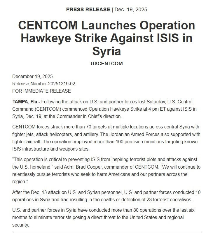 ABD ordusundan, Suriye’deki DEAŞ unsurlarına yönelik başlatılan askeri operasyon ile ilgili detaylı açıklama geldi. ABD Merkez Kuvvetler Komutanlığı’ndan (CENTCOM) yapılan açıklamada, Hawkeye Operasyonu’nun (Şahin Gözü Operasyonu) Suriye’nin Tedmur (Palmira) bölgesinde 2’si asker 3 ABD vatandaşının hayatını kaybettiği DEAŞ saldırısına misilleme olarak ABD Başkanı Donald Trump’ın talimatıyla başlatıldığı hatırlatılarak, "CENTCOM güçleri, savaş uçakları, saldırı helikopterleri ve ağır silahlarla Suriye’nin merkezindeki birçok noktada 70’ten fazla hedefi vurdu. Ürdün Silahlı Kuvvetleri de savaş uçaklarıyla operasyona destek verdi. Operasyonda, DEAŞ’ın bilinen altyapı ve silah depolarını hedef alan 100’den fazla hassas mühimmat kullanıldı" bilgisi paylaşıldı.