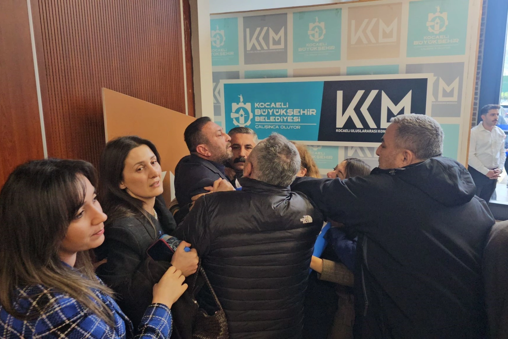 Kocaeli Kongre Merkezi'nde 162 gündem maddesini görüşmek üzere toplanan mecliste söz alan CHP'li meclis üyesi Ahmet Kadı, Gebze'deki Cemevi projesinin akıbetini sordu. Kadı'nın, "Bu bölgede yaşayan tüm canlar adına soruyorum; canlar cemevini bekliyor, ne zaman yapılacak?" sorusuna, AK Partili meclis üyesi Hasan Soba, "Sayın meclis üyem, daha Derince'de yeni açtık. Orada da planlarla ilgili sorun var. Öyle bir tablo çizdin ki, kolay kolay da müdahil olmam bu şeylere ama çok haksızlık yapıyorsun şehrine" yanıtını verdi. "Onun derdi kaos üretmek" Zinnur Büyükgöz ise "Ben cevaplandıracağım, merak etme" dediği sırada salondan da ses yükseldi. Tartışmalar sürerken, CHP’li meclis üyesi Erkan Uygun'un söz almadan konuşması ve yerinden müdahale etmesi üzerine Başkan Zinnur Büyükgöz, "Bakın sana söz vermedim. Onun derdi zaten kaos üretmek. Adam yerine koymayın onu" dedi. "Sayın başkan, bu ne şimdi?" Bu sözlere İzmit Belediye Başkanı Fatma Kaplan Hürriyet tepki göstererek, "Sayın başkan, bu ne şimdi? 'Adam yerine koymamak' ne demek? Sözünüzü geri alın" çağrısında bulundu. "Ben terbiyesiz değilim" Gerginlik tırmanırken Erkan Uygun ayağa kalkarak tepkisini sürdürdü. Büyükgöz ise Uygun'u yerine oturması konusunda uyararak, "Kaos üretmek için kalkıyorsun. Yerine otur sözümü geri alırım. Oradan kalkıyor, oraya geliyor. İnsanların üzerine yürüyor. Bu ne? Böyle bir şey olmaz. Oturduğu için sözümü geri aldım. Kaç defa söyleyeceğim, Türkçe konuşuyorum. 'Oturursa sözümü geri alacağım' dedim ve aldım, kendisi amaçlı ayakta duruyor. Terbiyesiz de sensin, bunu 4'üncü kez söylüyorsun. 'Terbiyesiz' diyerek kalktın, ben terbiyesiz değilim" diye konuştu. Salonda kalabalıkların birbirine yürümesi üzerine Büyükgöz, "Arkadaşlar lütfen geri çekilin" diyerek tarafları sakinleştirmeye çalıştı. CHP'li meclis üyesinden küfür Meclis salonunun dışında ise meclis üyeleri ve beraberindeki kalabalık koridorlarda birbirine girdi. Olay anında kaydedilen görüntülerde, CHP'li Erkan Uygun'un sinirli olduğu ve küfürler savurduğu görüldü. Yine görüntülere yansıyan arbedede, çevresindekilerin Uygun'u ağzını kapatarak sakinleştirmeye çabaladığı anlar da yer aldı. Yaşanan arbedenin tam ortasında kadınlar da kaldı. Çevredeki diğer meclis üyeleri ve güvenlik görevlileri, küfürlerin ve yumruklaşmanın yaşandığı kavgayı ayırmak için dakikalarca uğraştı.
