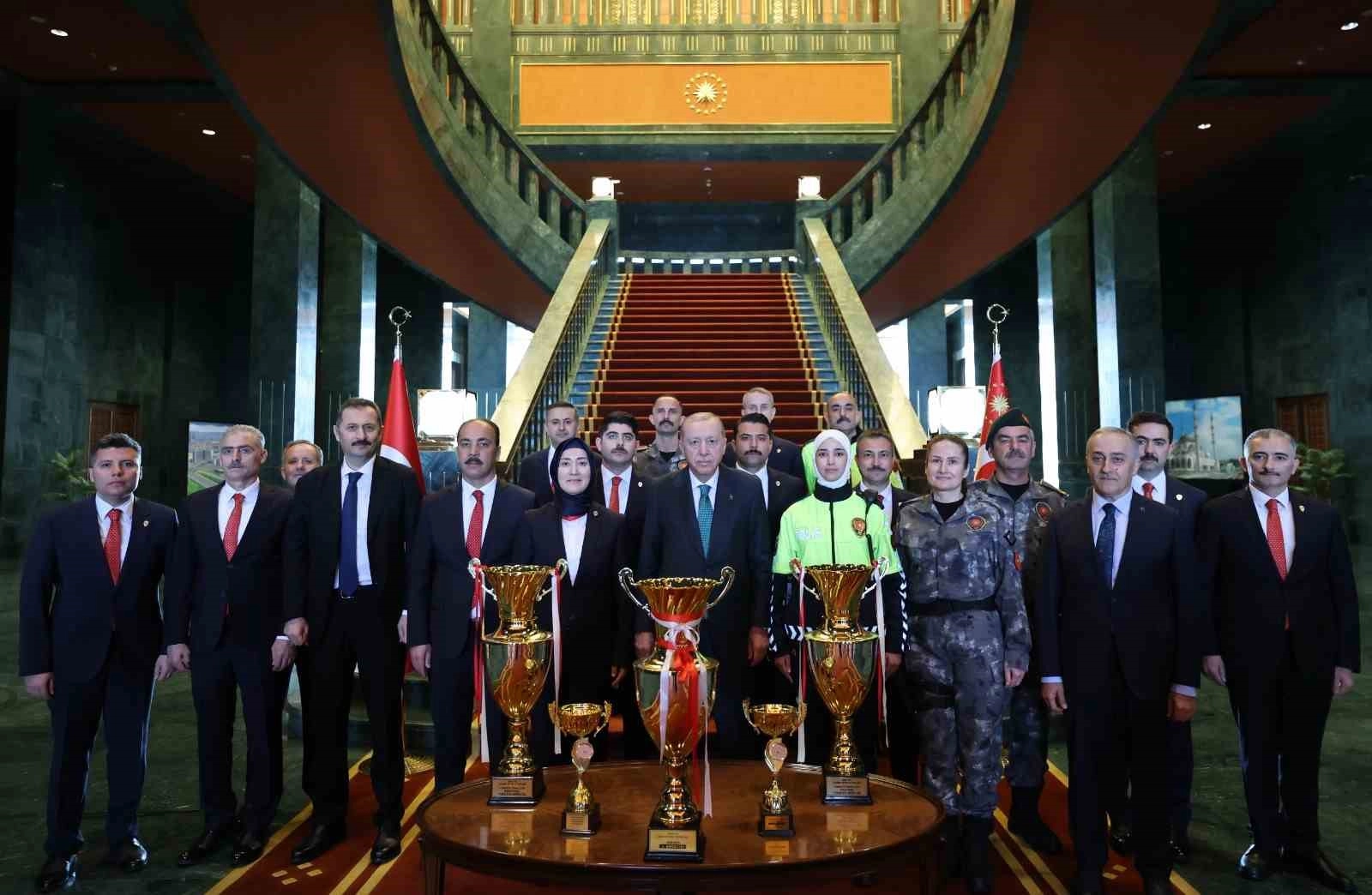 Cumhurbaşkanı Erdoğan, Cumhurbaşkanlığı Külliyesi’ne gelişinde Türk Polis Teşkilatı’nın 181. kuruluş yıl dönümü nedeniyle Cumhurbaşkanlığı Koruma Hizmetleri Genel Müdürlüğü personeli olan polisler tarafından karşılandı. Külliye avlusunda Cumhurbaşkanı Erdoğan, silahlı özel harekat polislerinden oluşan tören kıtasını selamladı. Türk Polis Teşkilatı’nın 181. kuruluş yıl dönümü dolayısıyla yapılan karşılamada, Cumhurbaşkanlığında farklı birimlerde görev yapan polisler ile çeşitli spor branşlarında başarı elde eden polisler de yer aldı. Cumhurbaşkanı Erdoğan, polis memurlarıyla günün anısına hatıra fotoğrafı çektirdi.