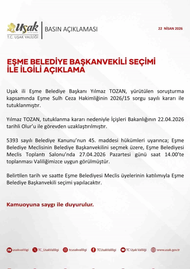 Uşak Valiliğince yapılan açıklamaya göre; "Uşak ili Eşme Belediye Başkanı Yılmaz Tozan, yürütülen soruşturma kapsamında Eşme Sulh Ceza Hakimliğinin 2026/15 sorgu sayılı kararı ile tutuklanmıştır. Yılmaz Tozan, tutuklanma kararı nedeniyle İçişleri Bakanlığının 22 Nisan 2026 tarihli Olur’u ile görevden uzaklaştırılmıştır. 5393 sayılı Belediye Kanunu’nun 45. maddesi hükümleri uyarınca; Eşme Belediye Meclisinin Belediye Başkanvekilini seçmek üzere, Eşme Belediyesi Meclis Toplantı Salonu’nda 27 Nisan 2026 Pazartesi günü saat 14.00’te toplanması Valiliğimizce uygun görülmüştür. Belirtilen tarih ve saatte Eşme Belediyesi Meclis üyelerinin katılımıyla Eşme Belediye Başkanvekili seçimi yapılacaktır." ifadelerine yer verildi.