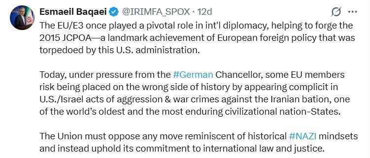 İran Dışişleri Bakanlığı Sözcüsü İsmail Bekayi, ABD ve İsrail’in İran’a yönelik saldırılarına destek veren Avrupa Birliği ülkelerine, "Birlik, tarihsel Nazi zihniyetlerini hatırlatan her türlü harekete karşı çıkmalı ve bunun yerine uluslararası hukuka ve adalete olan bağlılığını sürdürmelidir" çağrısında bulundu.