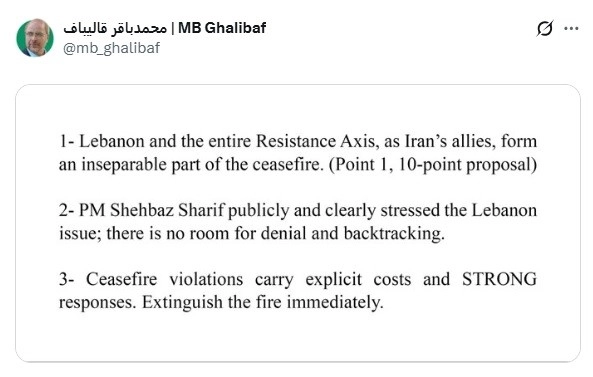 İran Meclis Başkanı Muhammed Bakır Galibaf, İsrail’in Lübnan’a saldırılarına ilişkin sosyal medyadan paylaşım yaptı. Galibaf, paylaşımında ABD ile 15 günlük ateşkes sağlanmasına yönelik sunulan maddeleri hatırlattı. Galibaf, "İran’ın müttefikleri olan Lübnan ve tüm direniş ekseni, ateşkesin ayrılmaz bir parçasını oluşturmaktadır. (10 maddelik teklifin 1. maddesi). Pakistan Başbakanı Şahbaz Şerif, Lübnan meselesini kamuoyu önünde açıkça vurguladı, inkara ve geri adıma yer yok" ifadelerini kullandı. İsrail’in Lübnan’a yönelik saldırılarıyla ateşkesin ihlal edilmesinin ciddi sonuçlar doğuracağı uyarısında bulunan Galibaf, "Ateşkes ihlalleri, bedellere ve sert karşılığa yol açar. Ateşi derhal söndürün" ifadelerini kullandı.