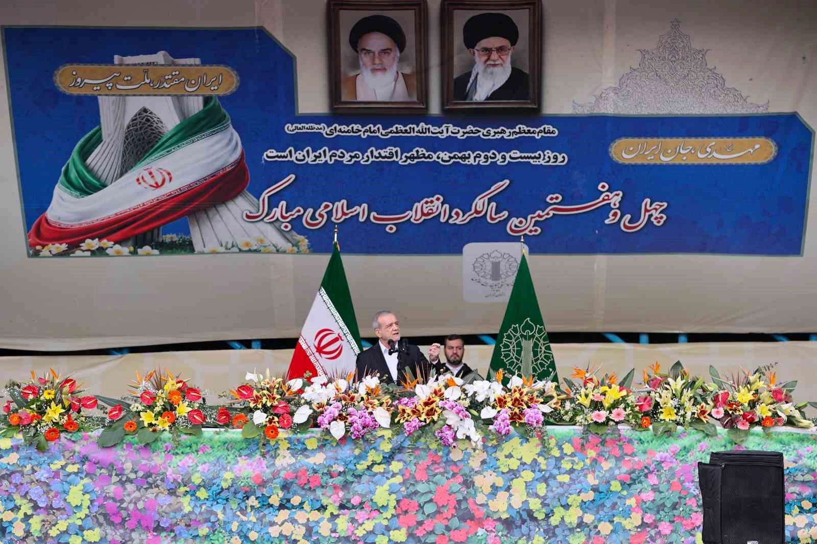 İran Cumhurbaşkanı Mesud Pezeşkiyan, İslam Devrimi’nin 47’nci yıl dönümü etkinlikleri kapsamında Tahran’daki Azadi Meydanı’nda halka hitap etti. Pezeşkiyan, düşmanın devrimin ilk gününden itibaren fitne ve darbe girişimleriyle İran’ı hedef aldığını savunarak, ABD ve Avrupa’nın devrimi yok etmeye çalıştığını, ancak başarılı olamadığını söyledi. Son dönemde ülkede yaşanan protestolara değinen Pezeşkiyan, "8 ve 9 Ocak günlerinde yaşananlar hepimizin kalbinde büyük bir acı bıraktı. Halkımıza karşı mahcubuz ve bu olaylarda zarar gören herkese hizmet etmeyi görev biliyoruz" diye konuştu.
