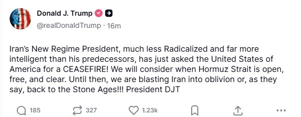 ABD Başkanı Donald Trump, Trurth Social platformundan İran’a ilişkin paylaşım yaptı. Trump paylaşımda, "İran’da yeni rejimin lideri, öncekilerden çok daha az radikalleşmiş ve çok daha zeki bir kişi olarak, ABD’den ateşkes talep etti. Hürmüz Boğazı ne zaman açık, serbest ve güvenli hale gelirse bunu o zaman değerlendireceğiz. O zamana kadar İran’ı yerle bir edeceğiz ya da deyim yerindeyse taş devrine döndüreceğiz" ifadelerini kullandı.