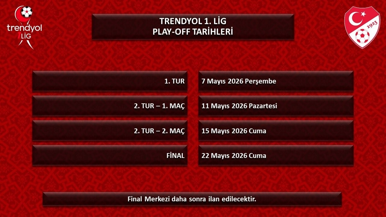 Türkiye Futbol Federasyonu (TFF), 1. Lig, 2. Lig ve 3. Lig’de play-off tarihlerinin belirlendiğini açıkladı. Açıklamada final müsabakalarının oynanacağı merkezlerin daha sonra ilan edileceği belirtildi.