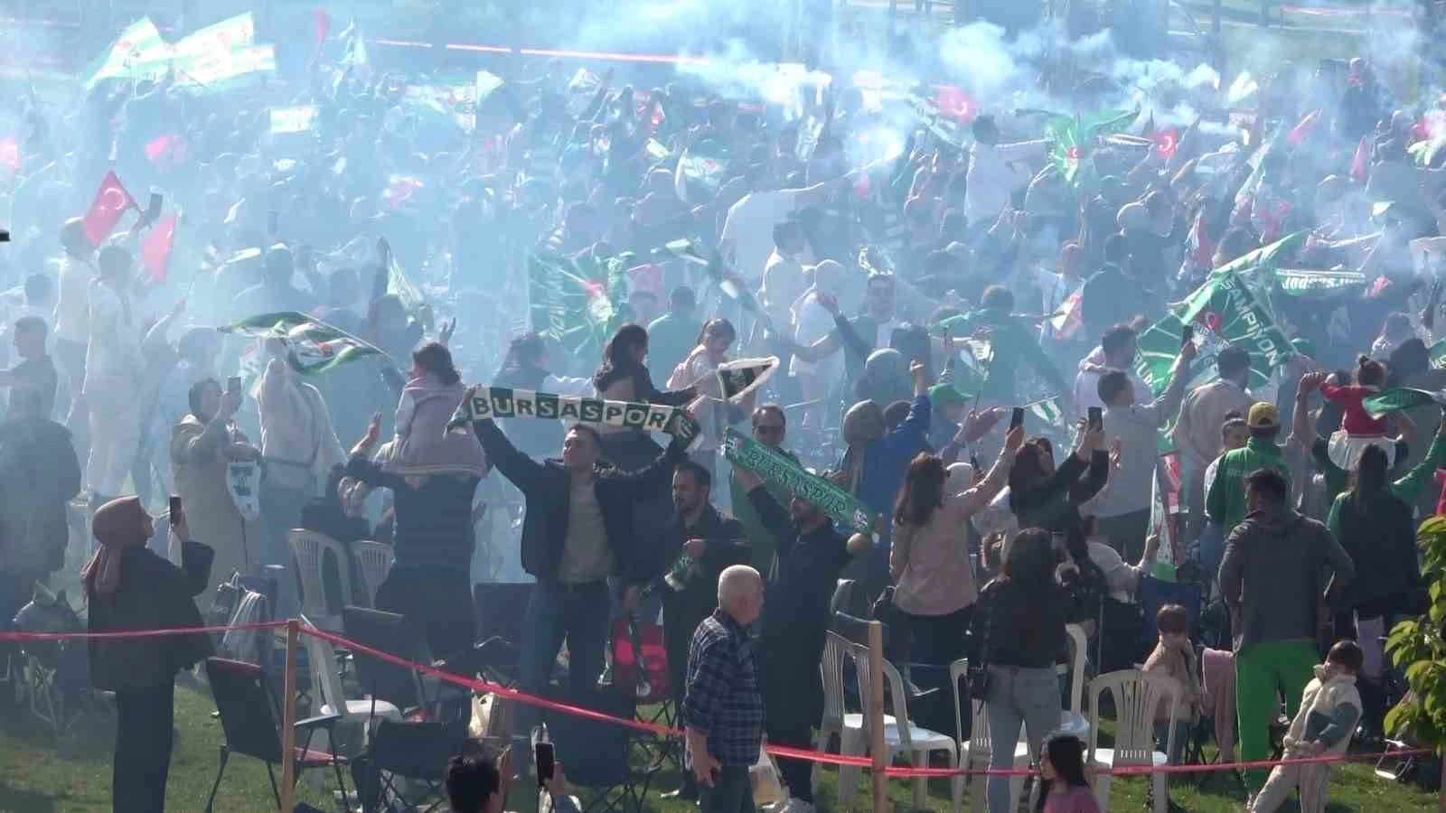 Millet Bahçesi ve Hüdavendigar Kent Parkı’nda toplanan Bursaspor taraftarları, maçı hep birlikte izleyerek şampiyonluk sevincini yaşadı. Maçın bitiş düdüğüyle birlikte ellerinde yeşil-beyaz bayraklarla meydanları dolduran taraftarlar, meşaleler yakarak şampiyonluğu kutladı.