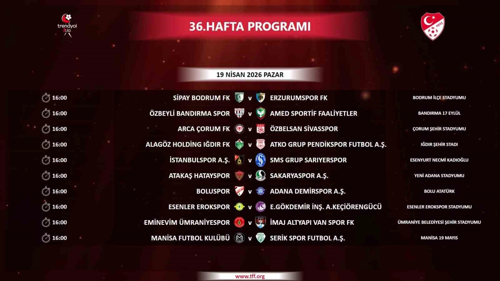 Trendyol 1. Lig’de 36. hafta programı şu şekilde: