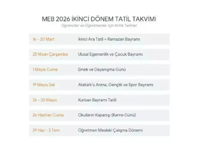 Milli Eğitim Bakanlığı'nın belirlediği çalışma takvimi sayesinde okulların ikinci dönemindeki tatil günleri kesinleşmiş oldu. Takvim, özellikle Mart ayında gerçekleşecek ara tatilin Ramazan Bayramı ile çakışması nedeniyle dikkat çekiyor.