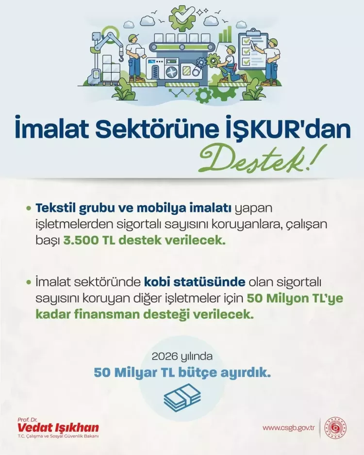 Çalışma ve Sosyal Güvenlik Bakanı Vedat Işıkhan, Sosyal hesabından "İmalat sektörüne İŞKUR'dan güçlü destek" başlıklı paylaşım yaptı.