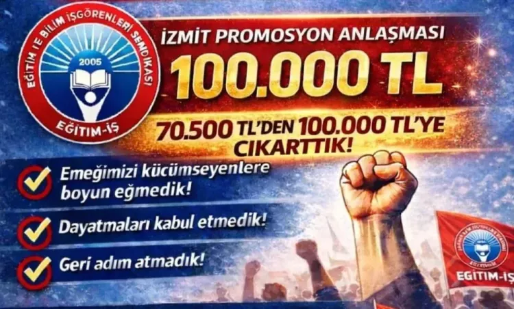 Eğitim İş Kocaeli 1 No’lu Şube Yönetimi, kazanılan hakların tüm eğitim çalışanlarına hayırlı olmasını dileyerek imza sürecinin tamamlandığını belirtti. Belirlenen takvime göre, 100 bin TL'lik promosyon tutarı 15 Mart tarihinde personelin hesaplarına tek seferde, peşin olarak yatırılacak.