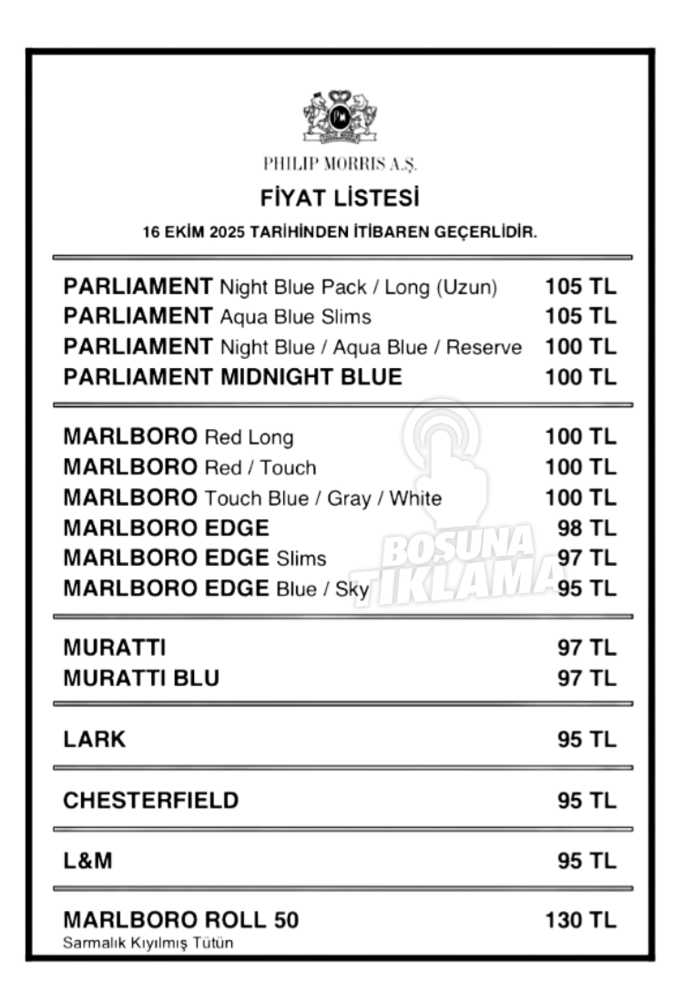 Firmanın ürettiği en ucuz sigara 95 liraya yükselirken, pazarda en fazla talep gören ürünleri ise 100 ve 105 TL'den satışa sunulacak. Philip Morris'in ardından rakip firmaların da bu hafta bitmeden fiyatlarına zam yapması bekleniyor.