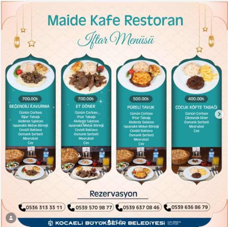 Kocaeli Büyükşehir Belediyesine bağlı Antikkapı AŞ. bünyesinde faaliyet gösteren Maide Restoran’ın 1 ay boyunca müşterilerine sunacağı 2026 iftar menüsü ve fiyatları duyuruldu.