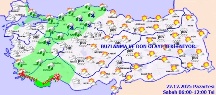 Gece ve sabah saatlerinde kuzey, iç ve doğu kesimlerde şiddetli soğuk, buzlanma ve don ile birlikte pus ve yer yer sis görülecek. MGM; Antalya çevreleri ile Muğla'nın kıyı kesimlerinde yer yer kuvvetli olması beklendiğinden sel, su baskını, yıldırım, ulaşımda aksamalar, kuvvetli rüzgar ve hortum uyarısı yaptı.