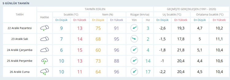 Kocaeli'de ise bugün sağanak yağış etkili olacak. Kentte en düşük hava sıcaklığı 9, en yüksek 13 derece olarak etkisini gösterecek. Salı bulutlu en düşük 7, en yüksek 14 derece. Çarşamba bulutlu en düşük 6, en yüksek 15. Perşembe en sağanak yağışlı en düşük 10, en yüksek 13 derece. Cuma sağanak yağışlı en düşük 10, en yüksek 11 derece dolaylarına seyredecek.