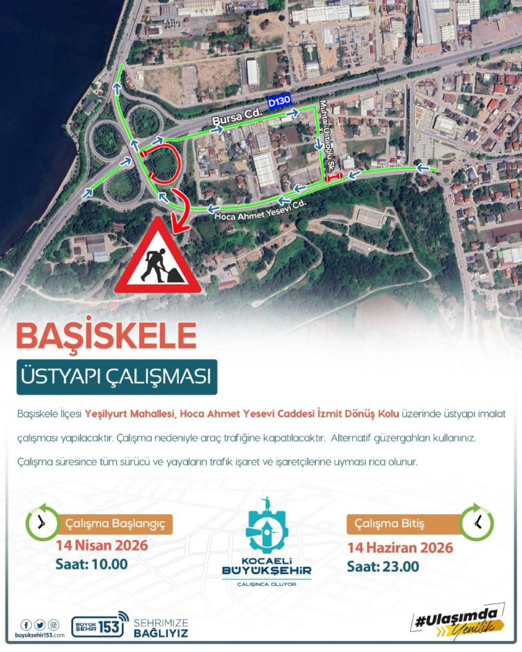 Kocaeli’de ulaşım altyapısını güçlendirecek önemli projelerden biri olan “D-130 Karayolu Başiskele Kavşağı Koridor Projesi 1. Etap Yapım İşi” tüm hızıyla devam ediyor. Bu kapsamda D-130 Karayolu ile Ömer Türkçakal Bulvarı (Sahil Yolu) arasındaki bağlantının Yuvacık Kavşağı’ndan ayrılmasını sağlayacak yeni bağlantı kolunda çalışmalar son aşamaya ulaştı. Söz konusu çalışmaların gerçekleştirilebilmesi için “Yuvacık Kavşağı” üzerindeki mevcut sahil yolu bağlantı kolu 14 Nisan Salı (yarın) günü itibariyle trafiğe kapatılacak. Bu alandaki çalışmaların 14 Haziran gününe kadar devam etmesi planlanıyor.